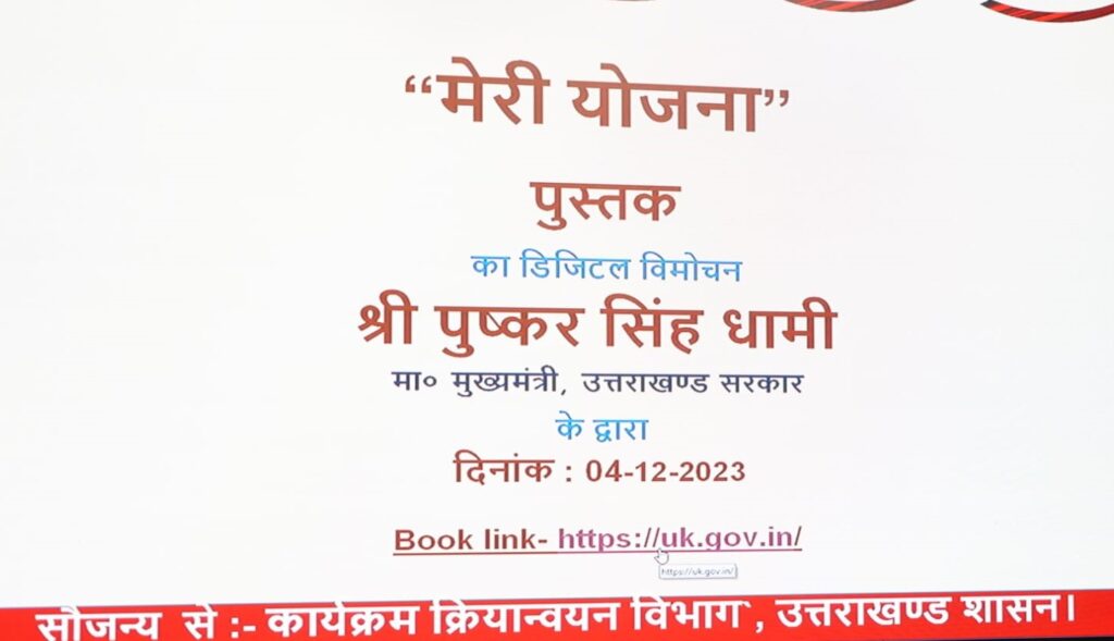मुख्यमंत्री पुष्कर सिंह धामी ने सोमवार को सचिवालय में कार्यक्रम क्रियान्वयन विभाग,उत्तराखण्ड शासन द्वारा तैयार की गई पुस्तक ‘‘ मेरी योजना’’ का विमोचन ई0 बुक के रूप में किया। मुख्यमंत्री ने कार्यक्रम क्रियान्वयन विभाग के प्रयासो की सराहना करते हुए कहा कि आम जनता के हित में लागू की जाने वाली विभिन्न योजनाओं को पुस्तक के माध्यम से सरल भाषा में समझाने का प्रयास किया गया है। इससे जन सामान्य को जनहितकारी योजनाओं को सरल भाषा में समझने में सुविधा होगी। उन्होंने कहा कि यह पुस्तक जनप्रतिनिधियों तथा आमजनमानस के साथ-साथ अधिकारीगणों एवं कार्मिकों के लिए भी उपयोगी होगी।
