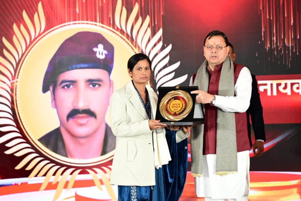 देहरादून: मुख्यमंत्री पुष्कर सिंह धामी ने शुक्रवार को सहस्त्रधारा रोड स्थित एक होटल में आयोजित उत्तराखंड अनन्य सम्मान कार्यक्रम में प्रतिभाग करते हुए शहीद सैनिकों के परिजनों को सम्मानित किया। इस अवसर पर मुख्यमंत्री ने वीर शहीदों को श्रद्धांजलि अर्पित करते हुए उनके परिजनों के संघर्ष, त्याग और देशभक्ति को नमन किया।