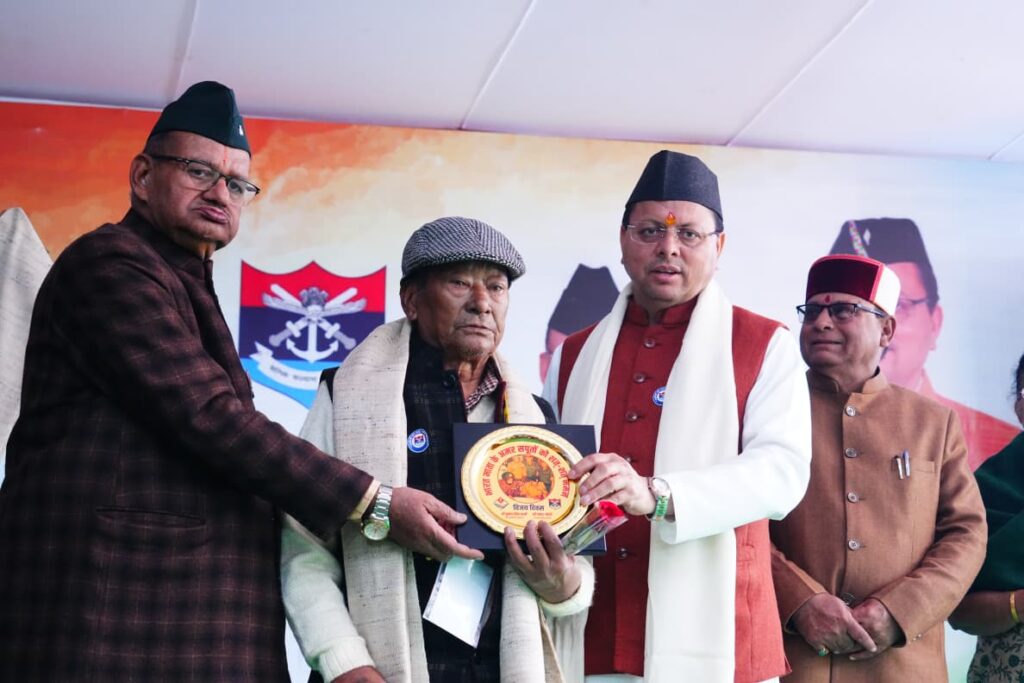 देहरादून: विजय दिवस के अवसर पर मंगलवार को मुख्यमंत्री पुष्कर सिंह धामी ने गांधी पार्क, देहरादून में आयोजित श्रद्धांजलि एवं सम्मान समारोह में प्रतिभाग किया। मुख्यमंत्री ने शहीद स्मारक पर पुष्पचक्र अर्पित कर 1971 के युद्ध में सर्वोच्च बलिदान देने वाले वीर जवानों को श्रद्धांजलि दी तथा युद्ध के सैनिकों और शहीदों के परिजनों को सम्मानित किया। इस अवसर पर मुख्यमंत्री ने सैनिक कल्याण निदेशालय एवं जिला सैनिक कल्याण कार्यालय—डीडीहाट, हरबर्टपुर, पिथौरागढ़ और हरिद्वार—इन सभी पाँच कार्यालयों को सरकारी वाहन उपलब्ध कराने की घोषणा की।